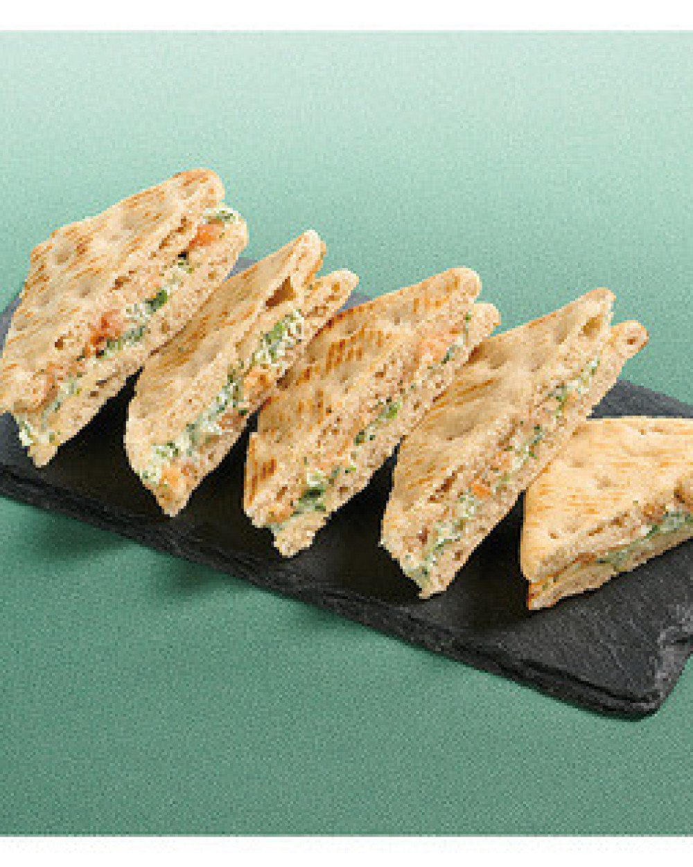 10 Mini sandwich club au pain polaire, tartare de saumon fumé, tartare de concombre, raifort et aneth